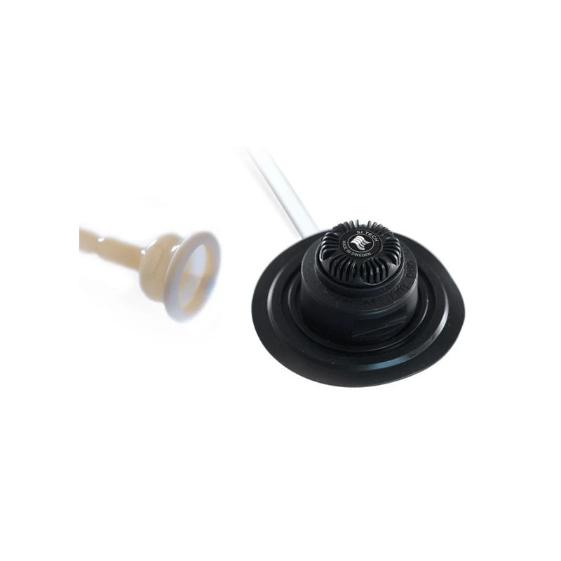 Valve urinaire pour vêtement sec. Elle se fixe sur la jambe du vêtement & est reliée au plongeur à l’aide d’un tube & d’un étui pénien.