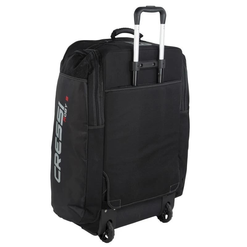 – 2 grandes poches à soufflets sur le devant, avec des fermetures à glissières, 2 poches latérales pour les palmes & 1 petite pochette sur le dessus pour l’adresse.