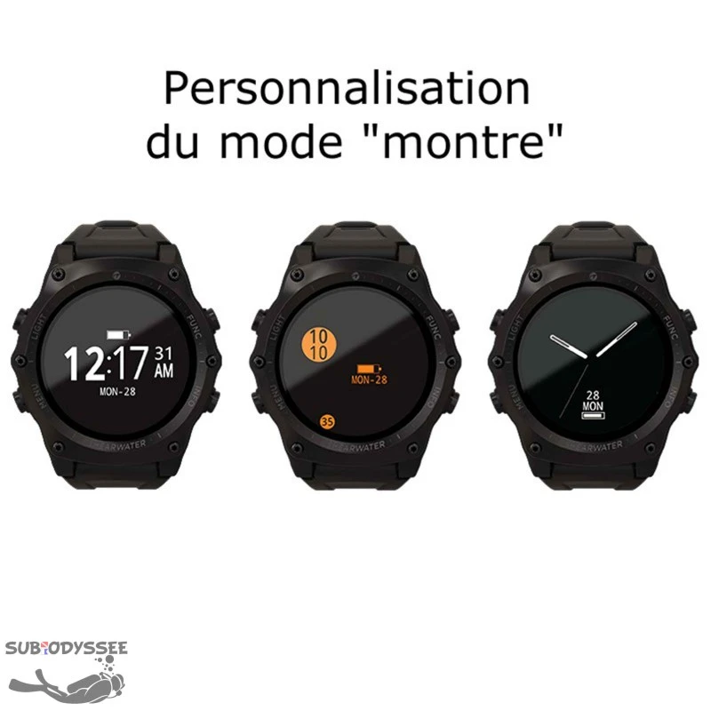 Modes : Ordinateur Air, Nitrox, Trimix Recycleur circuit ouvert, Recycleur circuit fermé, Profondimètre (Gauge avec enregistrement), Apnée, montre.